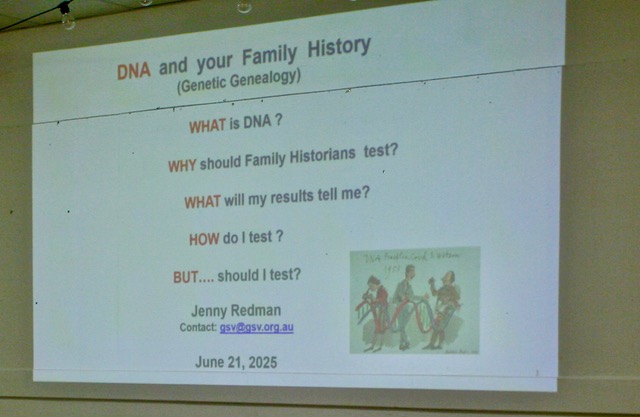 On Saturday 21st June, The Phillip Island and District Genealogical Society (PIADGS) was pleased to host a talk by Dr. Jenny Redman from the Genealogical Society of Victoria about that very subject, DNA. Dr Redman presented a very comprehensive talk concerning DNA, the process involved and the advantages and disadvantages of using this means for family history research. It was a very interesting and valuable talk, with many examples of where DNA successfully produced correct information. DNA is a means to provide a good guideline for investigation, as official records still must be viewed with suspicion until corroborating evidence is obtained. Following the talk a number of questions were asked relating to individual research and advice provided. A delicious afternoon tea was provided by members of the PIADGS, whilst those attending chatted, many who had travelled from off the Island.